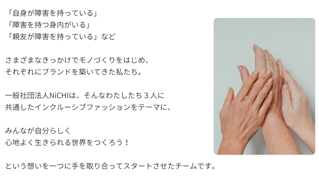 盲ろう者の祖母の一声から、生きづらさや不便さは誰かの価値に変わることに気づき、「ouca」を立ち上げました。誰しもが自分らしく人生を謳歌出来る世界を目指し、障害あるなし関係なく多様な方々とモノ・コト作りを行っています。自身も感覚過敏症でもあることから素材にこだわったインナー・靴下の開発や、「生活をoucaする」をコンセプトのイベントを企画しています